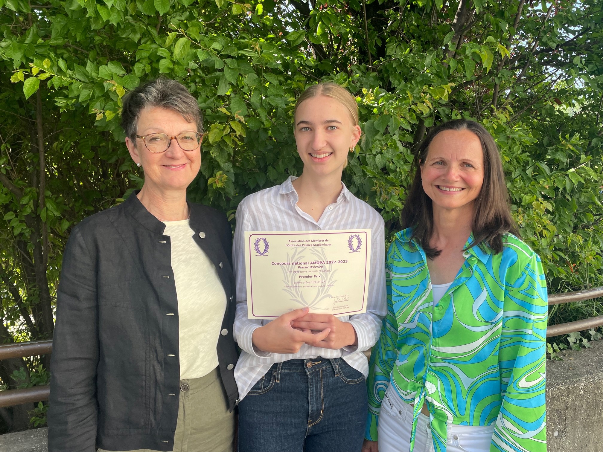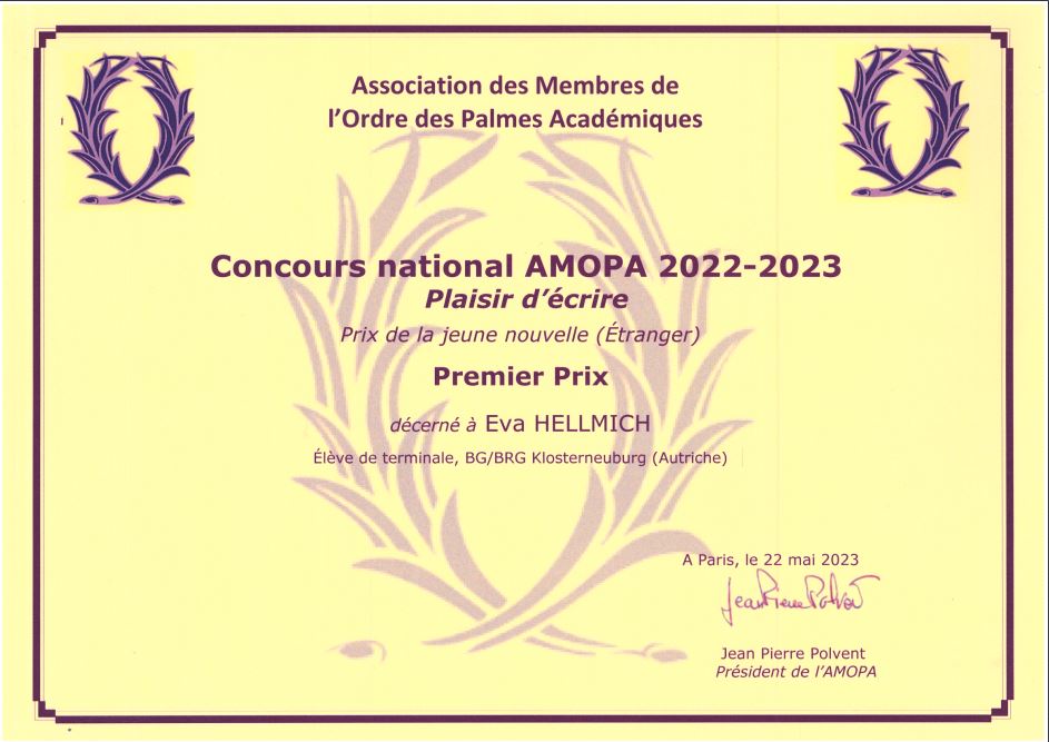 Wie bereits berichtet, wurde die von Eva Hellmich (8B) in französischer Sprache verfasste Novelle „Liebestraum“, von allen eingesendeten literarischen Werken in Österreich, als beste Produktion - von AMOPA Österreich (Association des membres de l‘ ordre des Palmes Académiques/Autriche) - prämiert.
