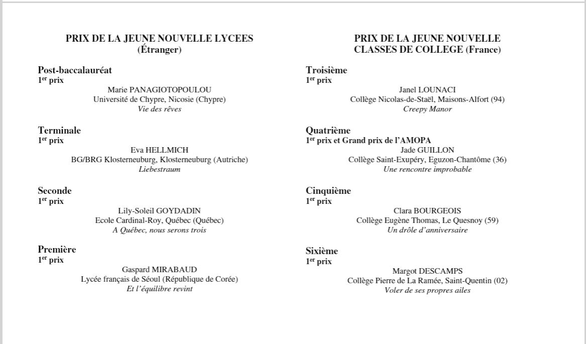 Von allen Einsendungen, die von den Ländern außerhalb Frankreichs eingereicht wurden, konnte Eva Hellmich mit ihrer sprachlichen Präzision, die sie in ihrer einfühlsamen Novelle umsetzte, die Jury überzeugen und wurde international mit dem 1. Preis ausgezeichnet.