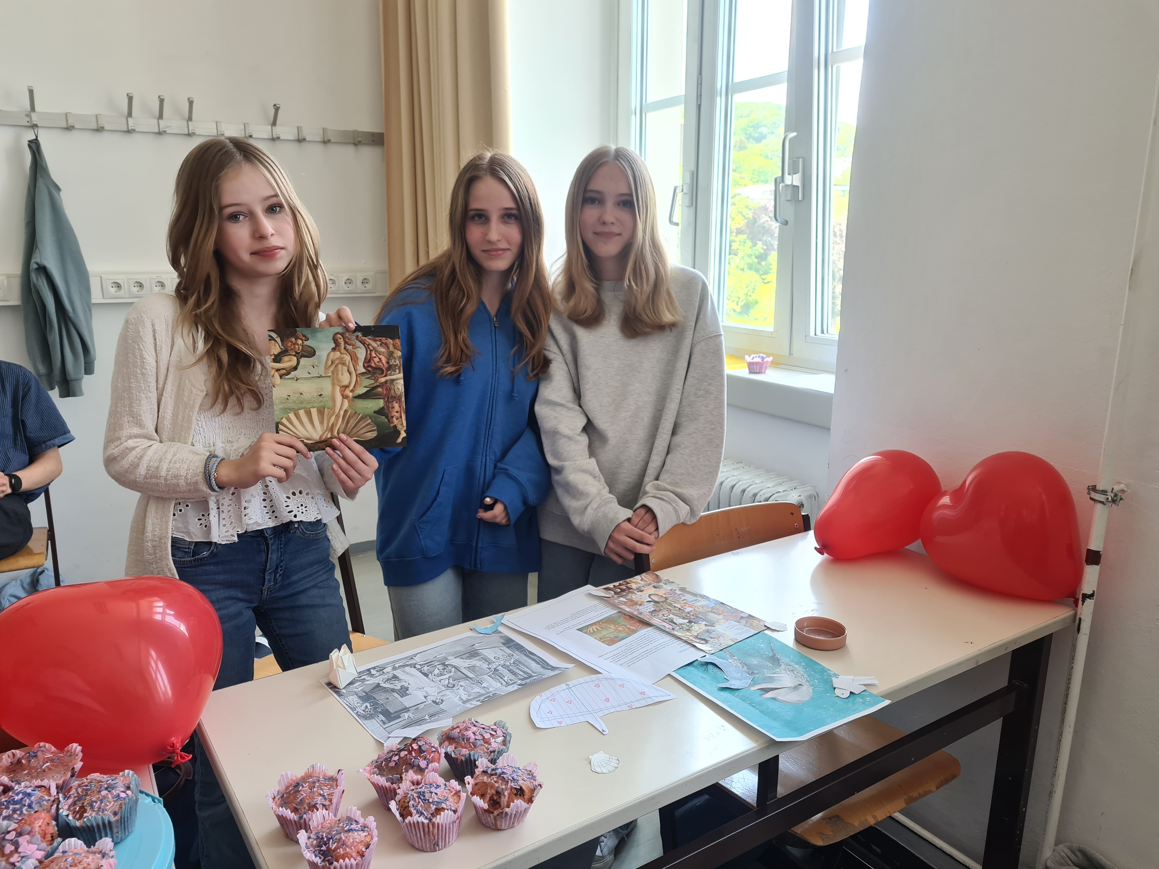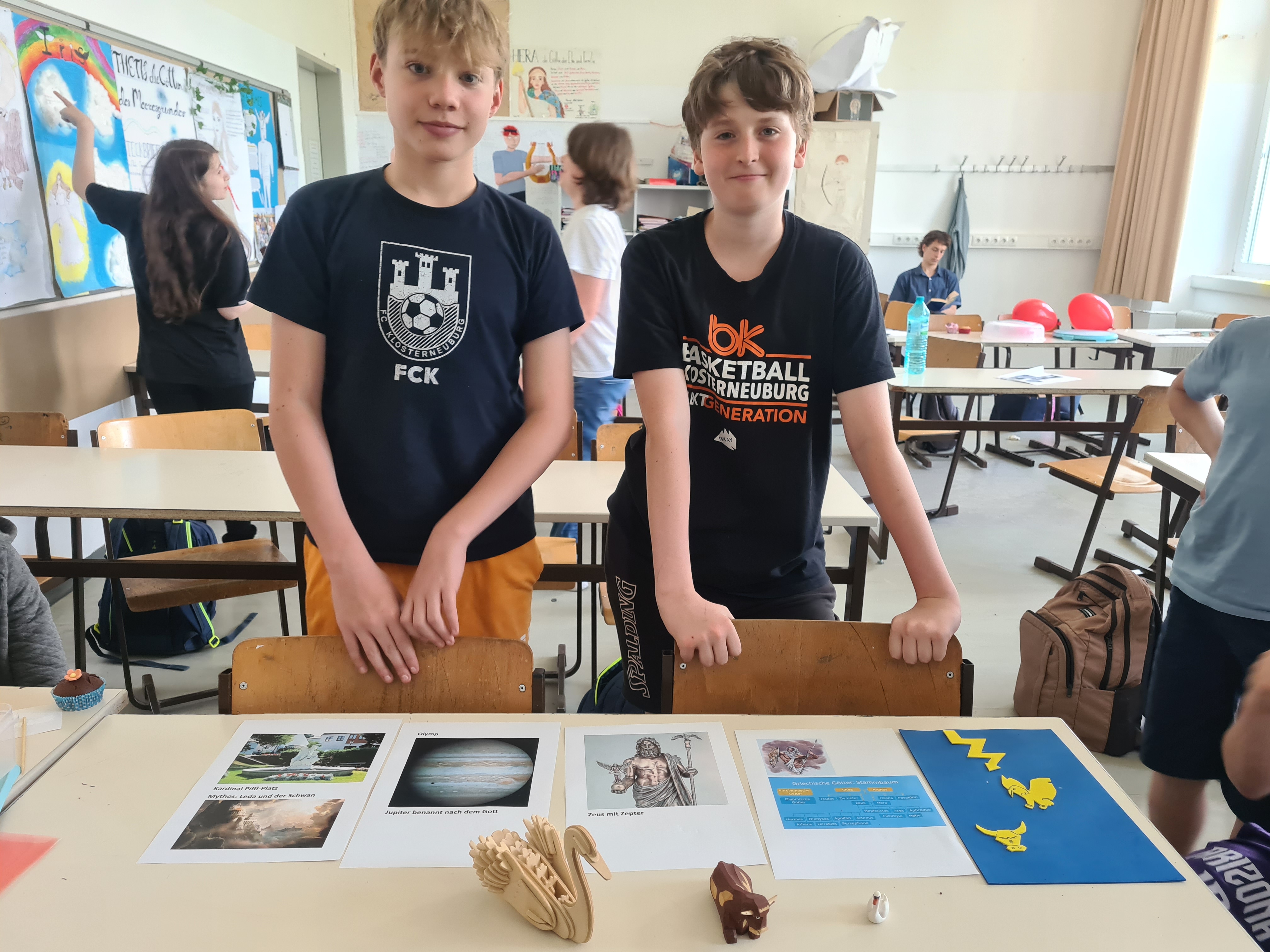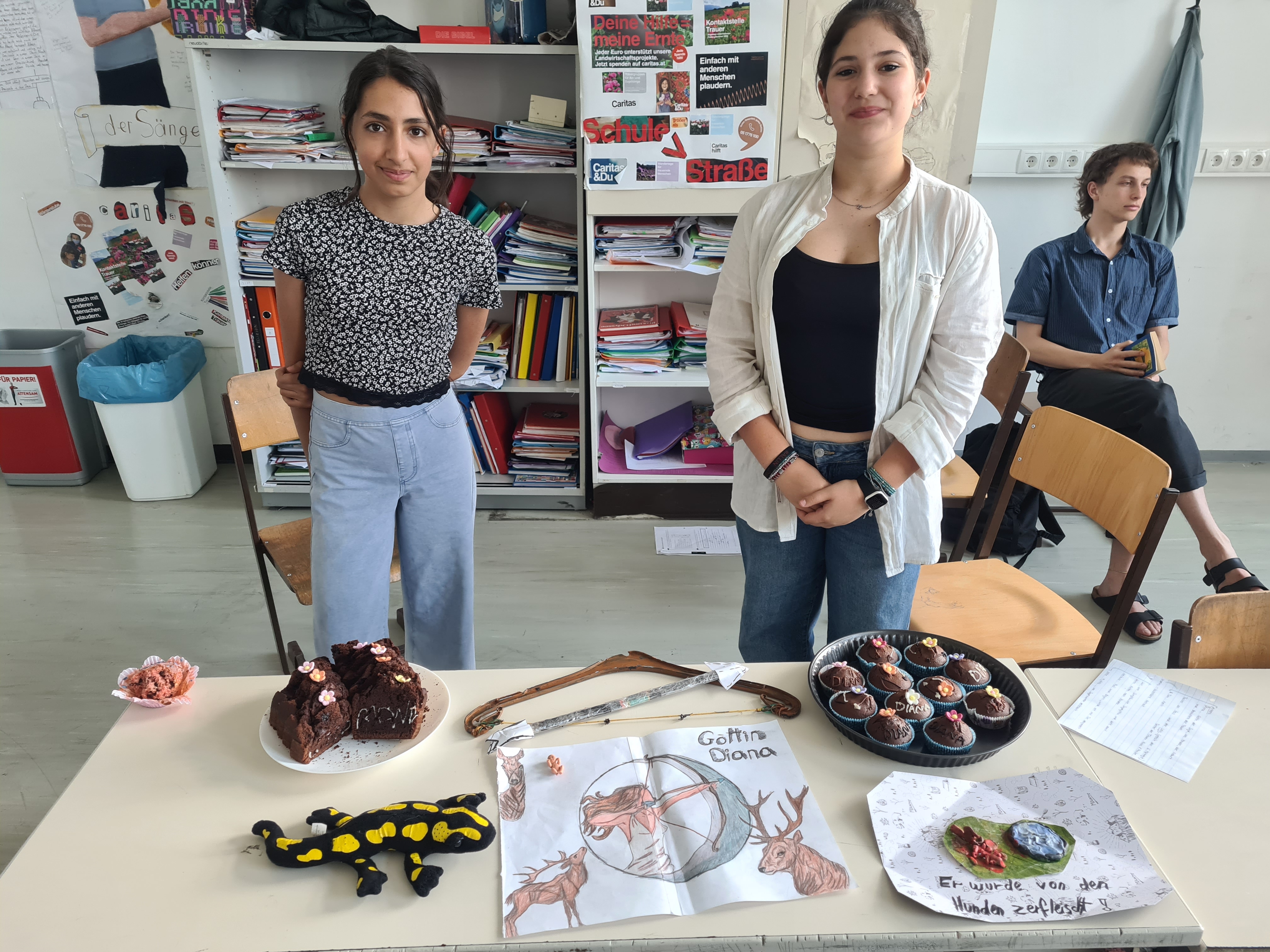 In der Lateindoppelstunde am Mittwoch dann hat sich der Klassenraum in ein Museum verwandelt und an den Tischen wurden von den Schülern die Gottheiten mit viel Selbstgebasteltem und-gebackenem präsentiert. Zum Beispiel gab es verführerische süße Herzerlmuffins bei Venus, Trauben zu verkosten bei Bacchus und sogar Mars - Schokoriegel, quasi einen Kriegsgott zum Vernaschen, bei Mars Museumstisch. Auch wurden Szenen aus dem Mythos lebendig nachgespielt und knifflige Quizfragen gestellt.
