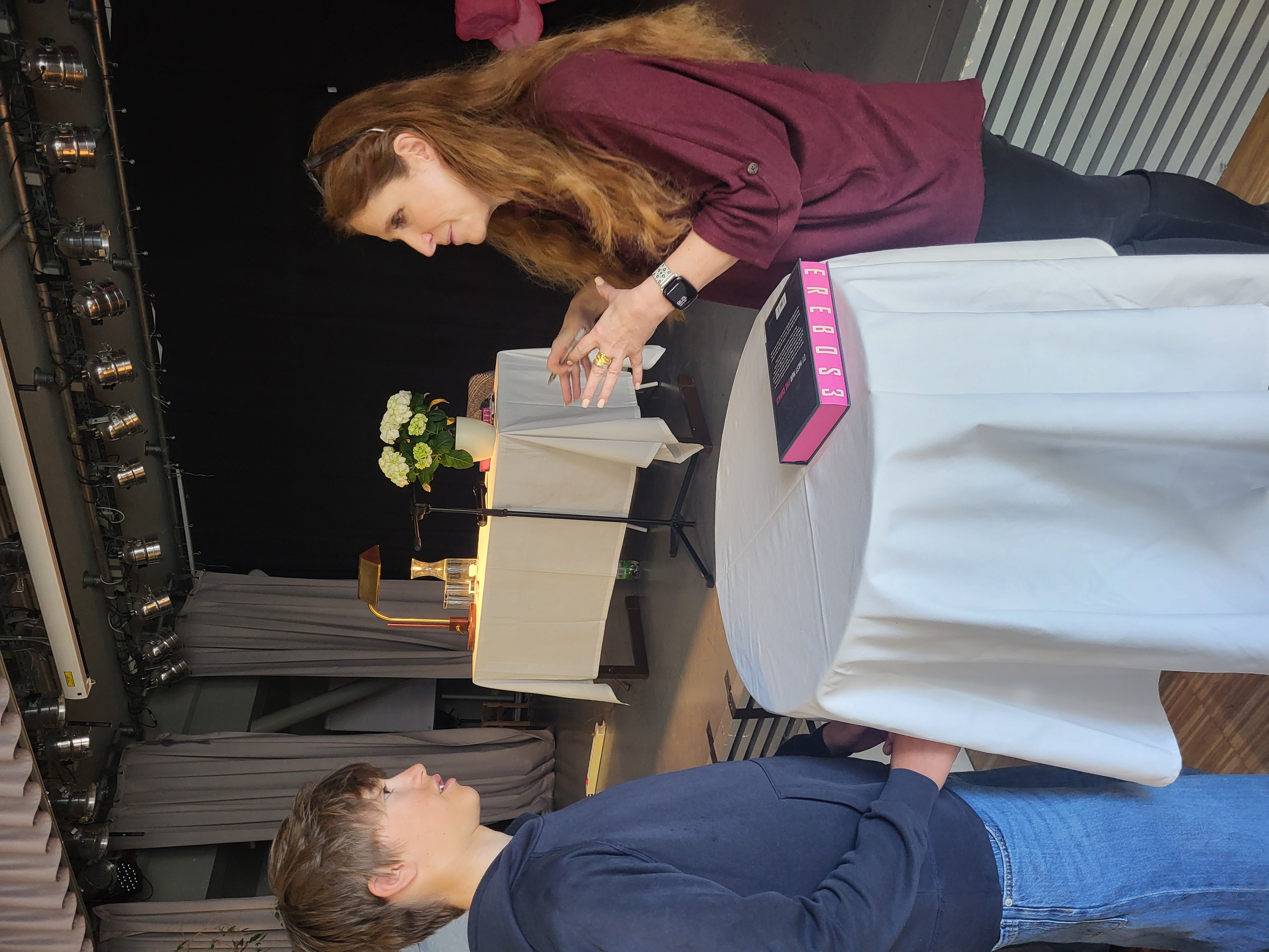 Neun Klassen, darunter einige echte Poznanski-Fans, und viele interessierte Lehrer*innen kamen, um der Fortsetzung der Geschichte rund um Nick Dunmore alias Sarius, dem Dunkelelf, zu lauschen. Danach plauderte die Autorin noch aus dem schriftstellerischen Nähkästchen, verriet etwa auf die Fragen aus dem Publikum, wie es möglich ist, jedes Jahr zwei Bücher zu verfassen, wie viel sie pro verkauftem Exemplar verdient und wem die Widmung „Für Leon“ in Erebos gilt. Am Ende gab es noch eine Signier-Viertelstunde, wobei nicht nur Bücher, sondern auch allerlei mit Unterschrift versehene Arme und Hände gesichtet wurden.