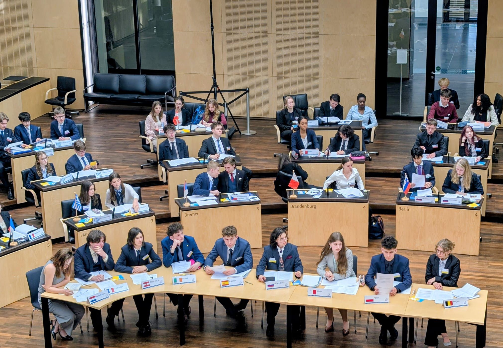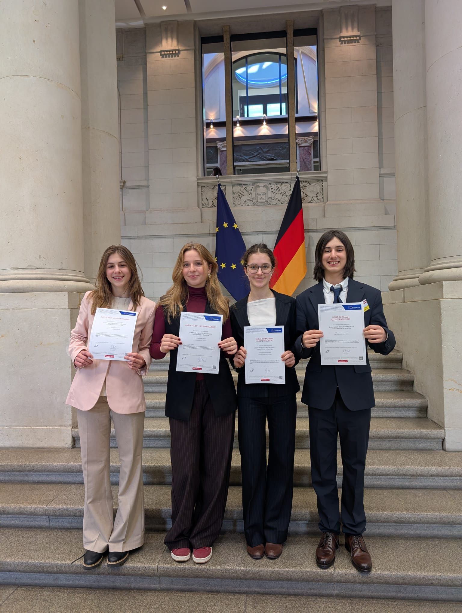 Vom 14. bis 18. März 2026 nahmen wir, Anna Jäger, Henri Fariello, Zoi Vogels und Emilie Timmerman aus der 5B, gemeinsam mit Mag. Sonja Windt am Model European Parliament (MEP) in Berlin teil. Das MEP ist ein internationales Planspiel, bei dem Schüler:innen in die Rolle von Abgeordneten des Europäischen Parlaments schlüpfen. In Ausschüssen und Plenarsitzungen diskutierten wir aktuelle politische Themen, erarbeiteten gemeinsame Resolutionen und lernten dabei die Abläufe der Europäischen Union praxisnah kennen. Besonders spannend war der Austausch mit Jugendlichen aus verschiedenen Ländern. Dabei lernten wir, kritisch zu denken und gemeinsam mit anderen Lösungen zu entwickeln.