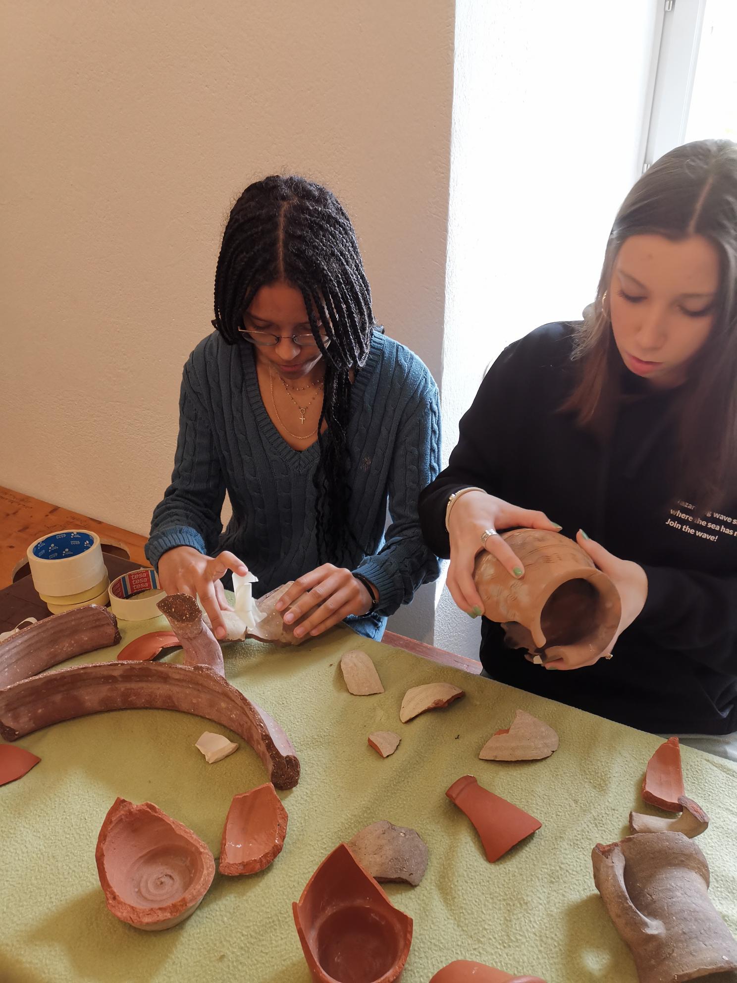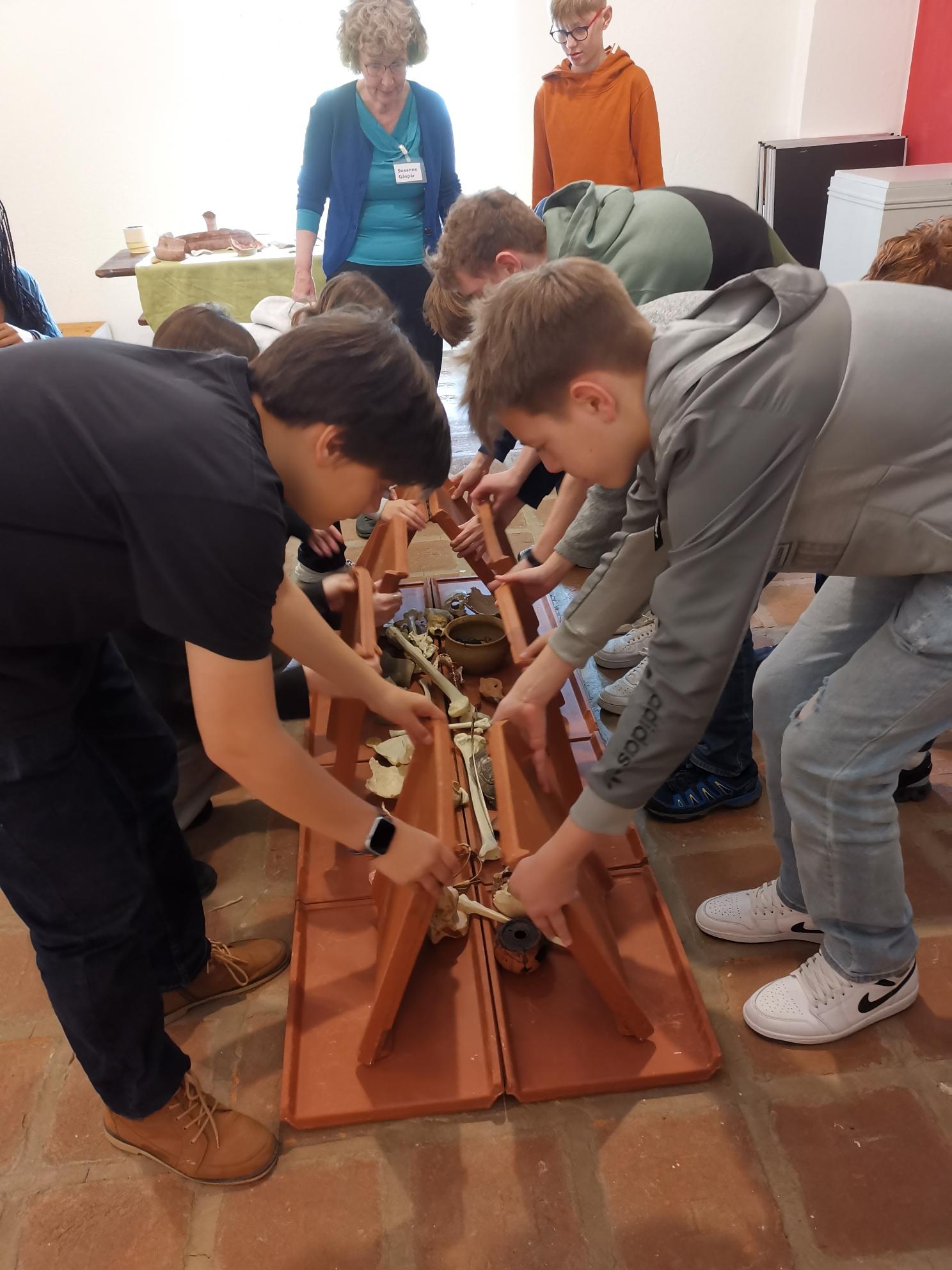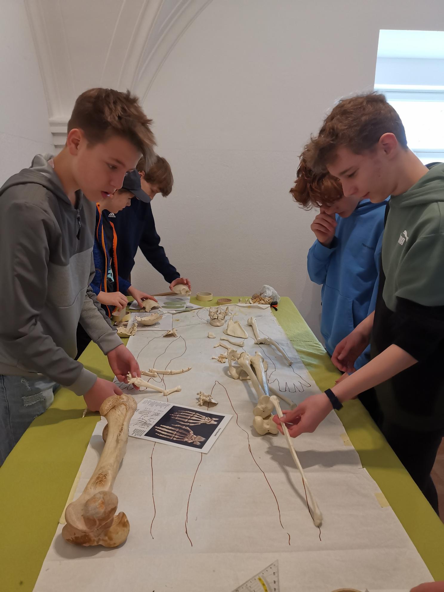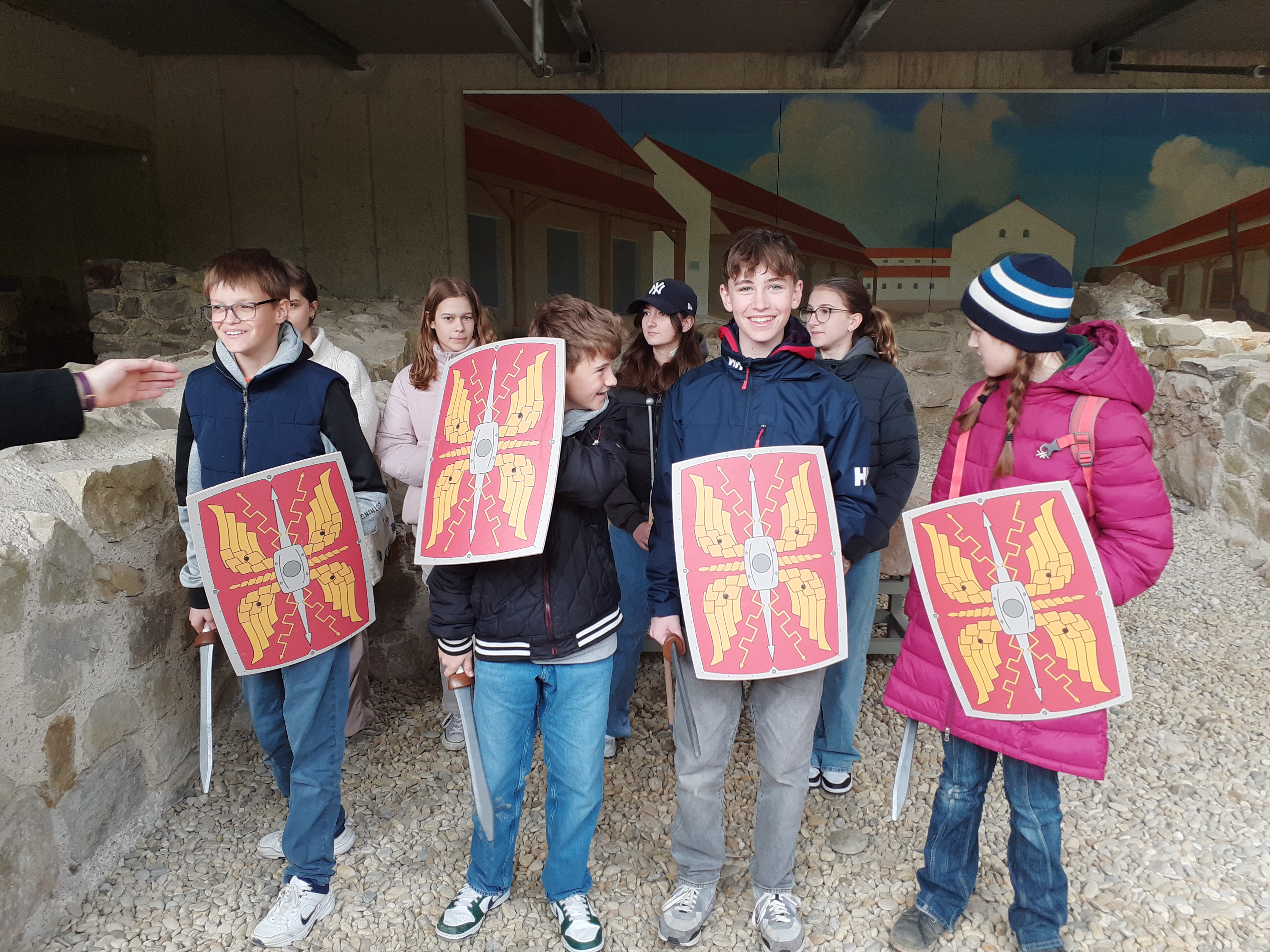 Warum kann man aus grünen Knochen bei einem Skelettfund auf eine weibliche Person schließen? Wo wurden im römischen Heer Speerkämpfer platziert? – Diese und ähnliche Fragen wurden den Schülerinnen und Schülern der 3DE bei ihrem Besuch des Römermuseums in Tulln am 25.04.2024 nicht nur theoretisch beantwortet: Bei der Führung „Pergite!“ maßen sie das einstige Römerlager trotz eisigen Windes mit eigenen Doppelschritten (lat. passus) ab und betätigten sich im Workshop „Extinguite–Luminate!“ engagiert als Hobbyarchäologen beim Zusammenbau eines Skeletts und der Untersuchung diverser Grabbeigaben.