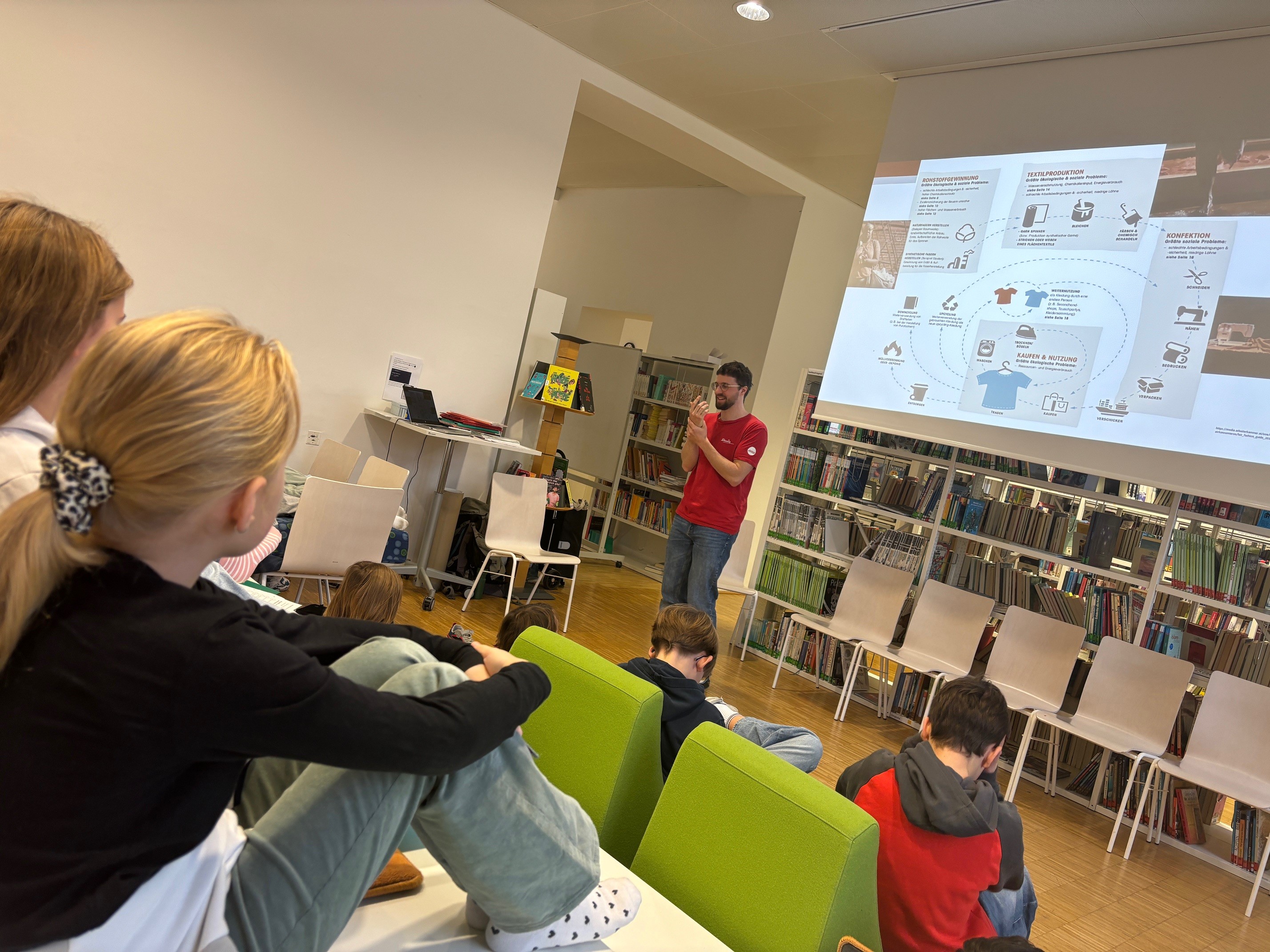 Im abschließenden Teil gab es für die Schüler:innen die Möglichkeit ihre Ergebnisse zu besprechen und Fragen wie z.B. warum Online-Anbieter wie Temu oder Shein ihre Waren so günstig anbieten können, was mit Kleidung in Altkleidersammlungen geschieht oder was man unter einem Existenzlohn versteht zu besprechen.