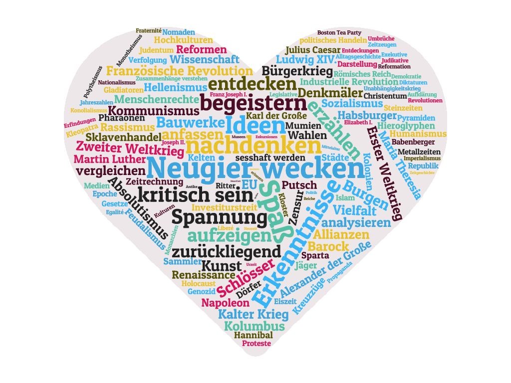Diese Worte, gesprochen von Winston Churchill, spiegeln wider, wie man sich mit der Geschichte der Menschheit auseinandersetzen kann. Dies versuchen wir im Geschichtsunterricht den Schülerinnen und Schülern näher zu bringen. Geschichtsunterricht besteht nicht nur aus dem Auswendiglernen von Fakten und Jahreszahlen, sondern auch aus kritischer Auseinandersetzung mit Vergangenem, Entdecken, dem Verstehen von Zusammenhängen und der Analyse von Quellen. Wie man durch die Word Cloud sehr gut erkennen kann, vernetzt das Fach Geschichte verschiedene Fächer miteinander: Durch das Auseinandersetzen mit Entdeckungsreisen, Eroberungsfeldzügen und anderen Kulturen laden wir das Fachgebiet der Geographie in den Geschichtsunterricht ein. Wenn wir uns mit griechischen oder römischen Göttern beschäftigen oder über Glaubenskriege sprechen, vernetzen wir unser Wissen mit den Inhalten des Religionsunterrichts. Wenn wir über Menschenrechte, Rassismus oder Aufklärung sprechen, stellen wir eine Verbindung zum Philosophieunterricht her. Geschichte ist daher nicht nur als einzelnes Schulfach zu verstehen oder als Tor zur Vergangenheit, sondern auch als Brücke zu anderen Disziplinen und als Handwerk, um die Menschheit zu verstehen.